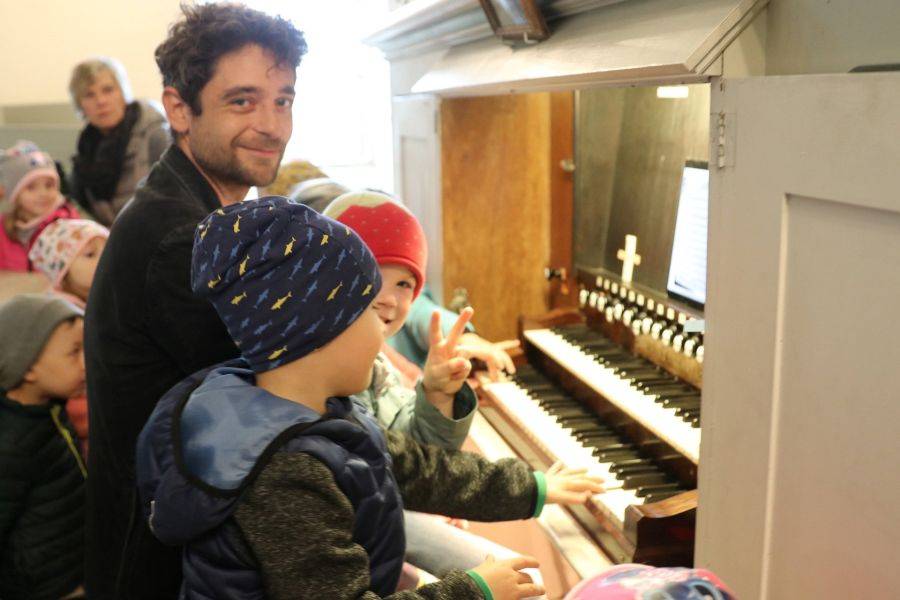 Danach durften die Mädchen und Jungen selbst auf die Empore steigen. Thomas Kübler zeigte, wie die Pfeifen Töne erzeugen, erklärte die verschiedenen Register und ließ die Kinder ausprobieren, wie ein Ton entsteht. Mit großen Augen verfolgten sie, wie aus Luft Musik wird.